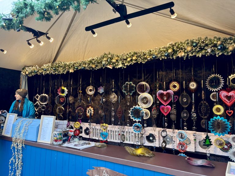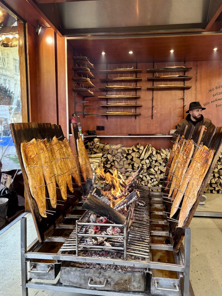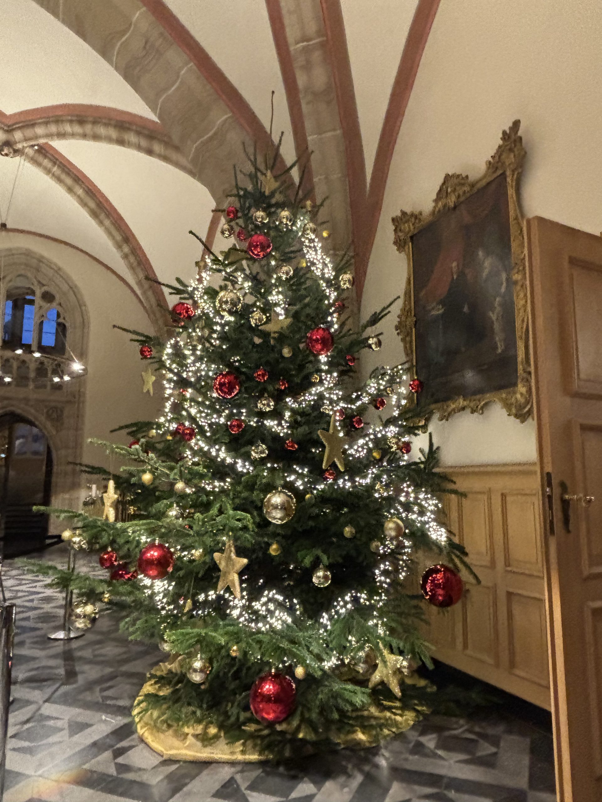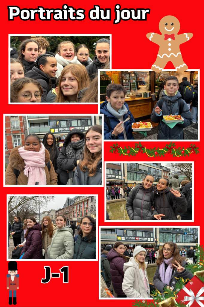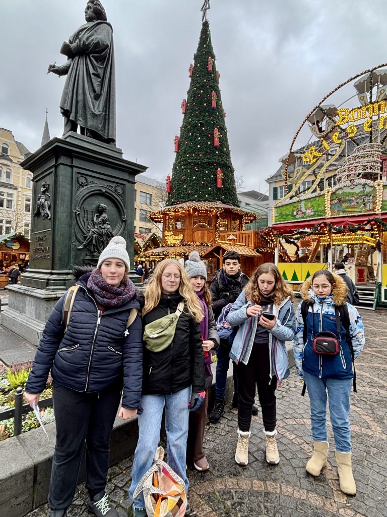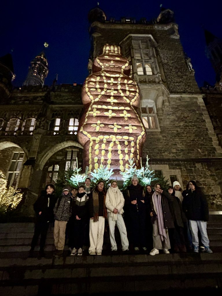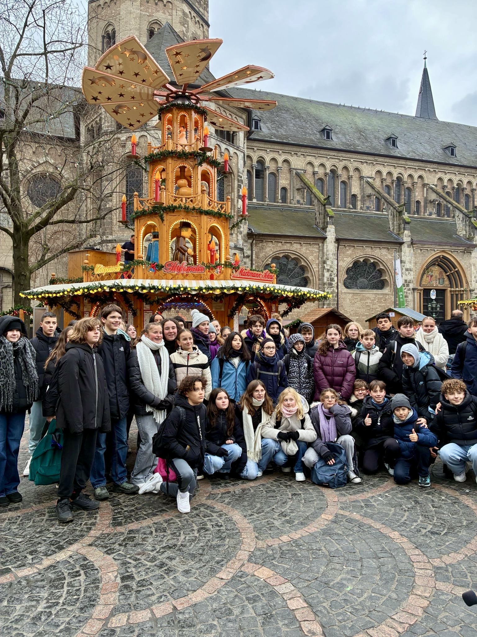 Ballade jusqu’au centre de la ville. Sur le marché de Noël, photo de groupe devant une pyramide de Noël (Weihnachtspyramide)