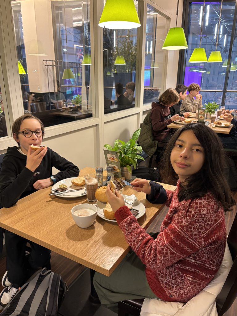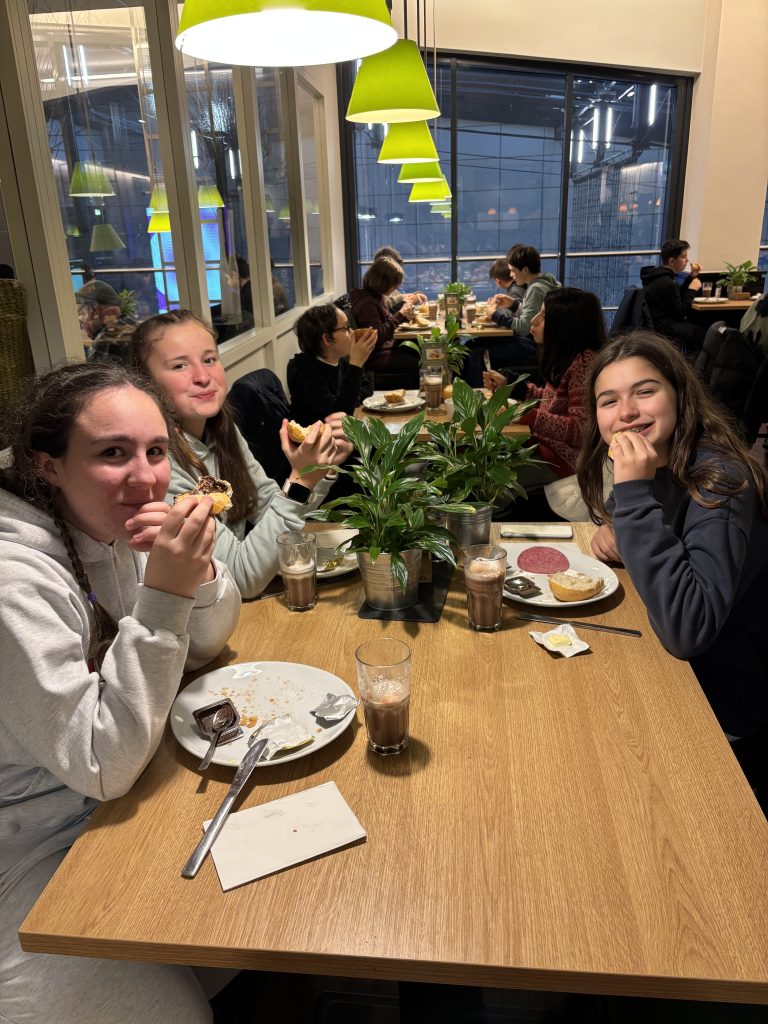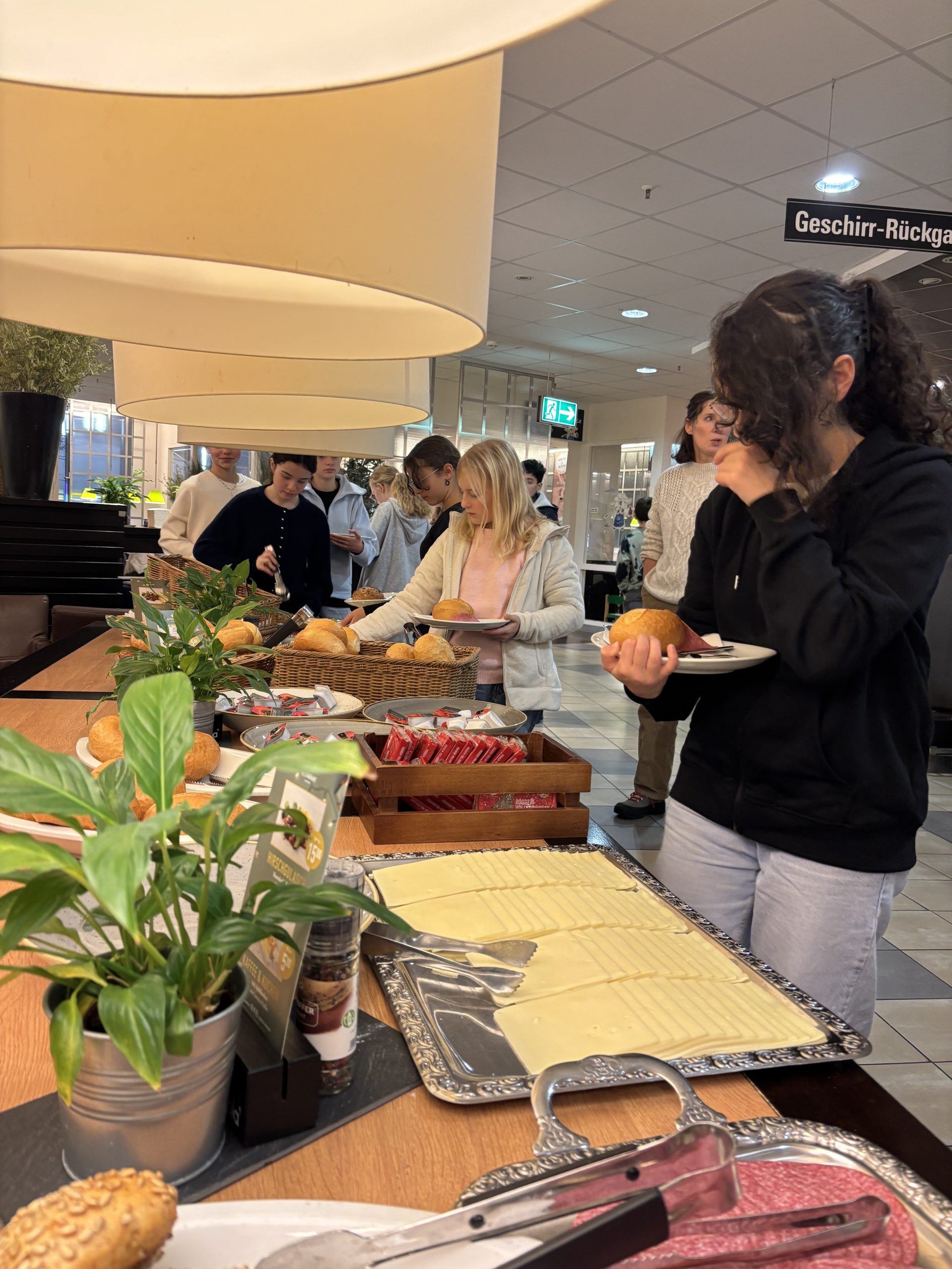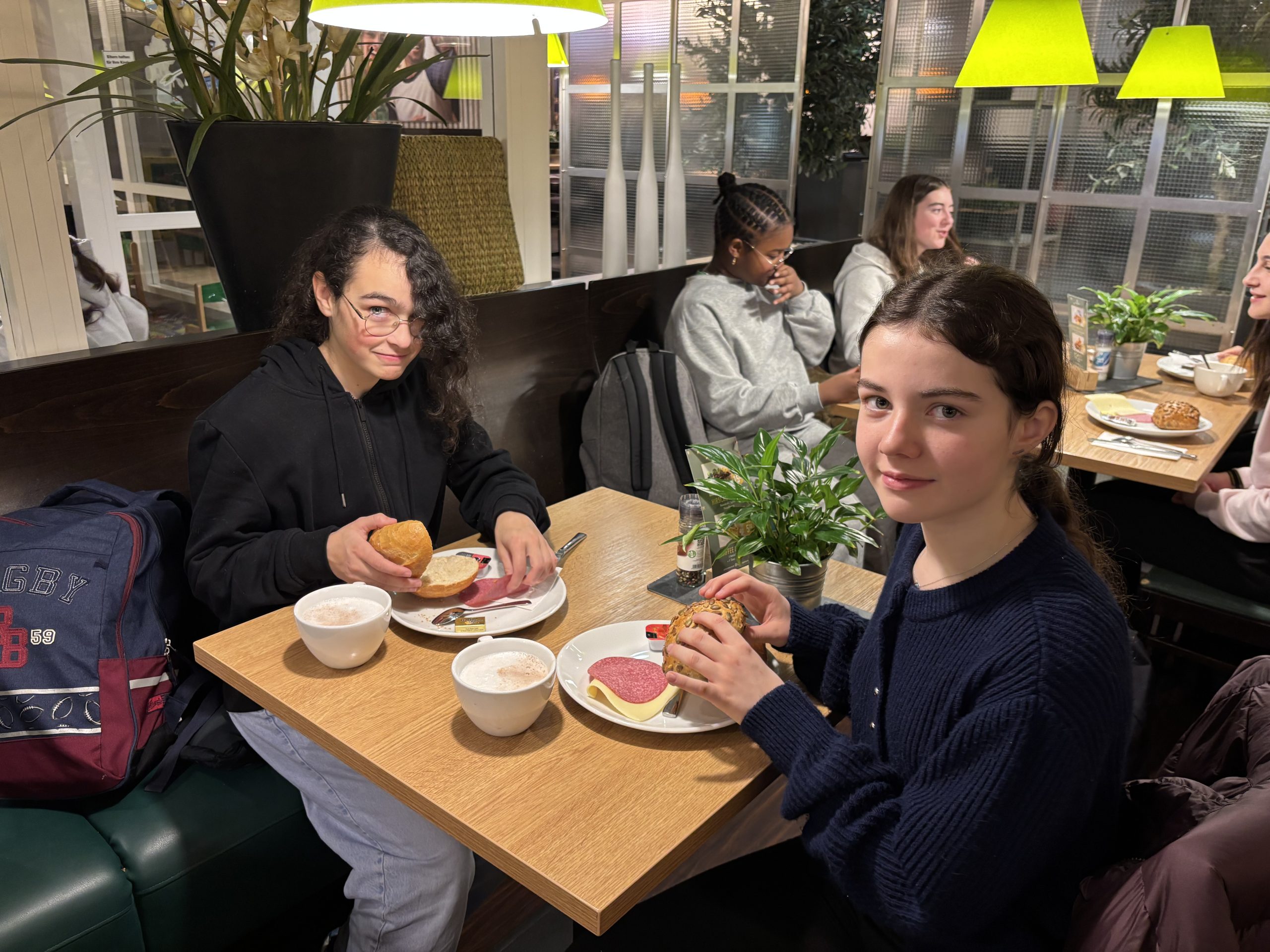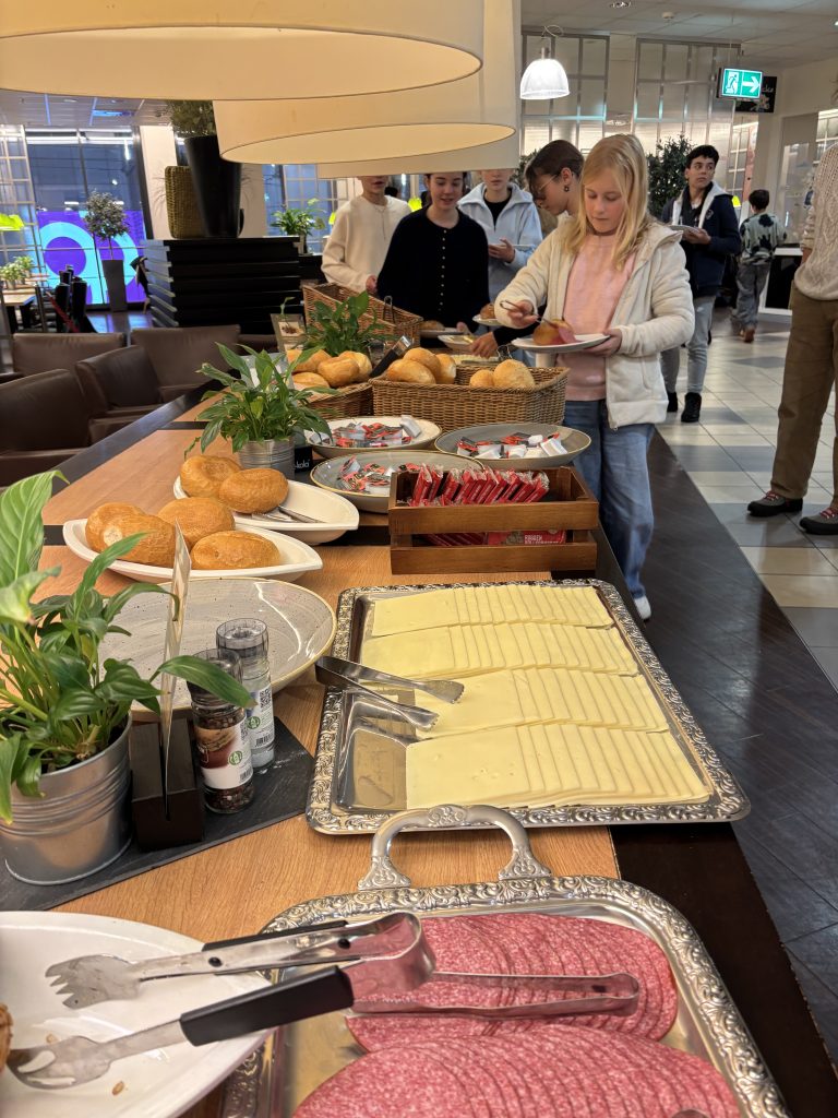 Après une nuit dans le bus, petit déjeuner typiquement allemand, avec pains variés, fromage, charcuterie, confiture, Nutella, beurre et boissons au choix.