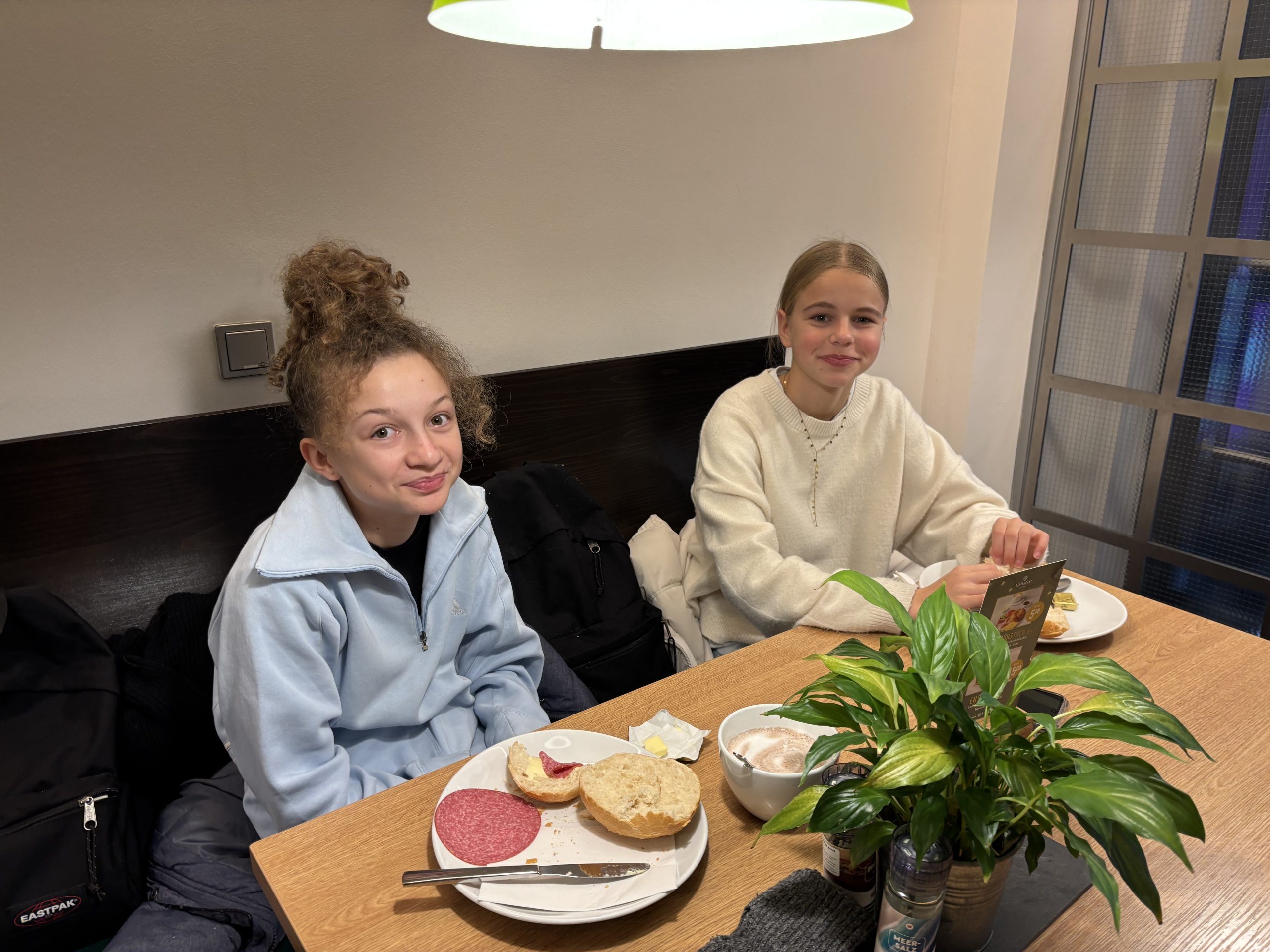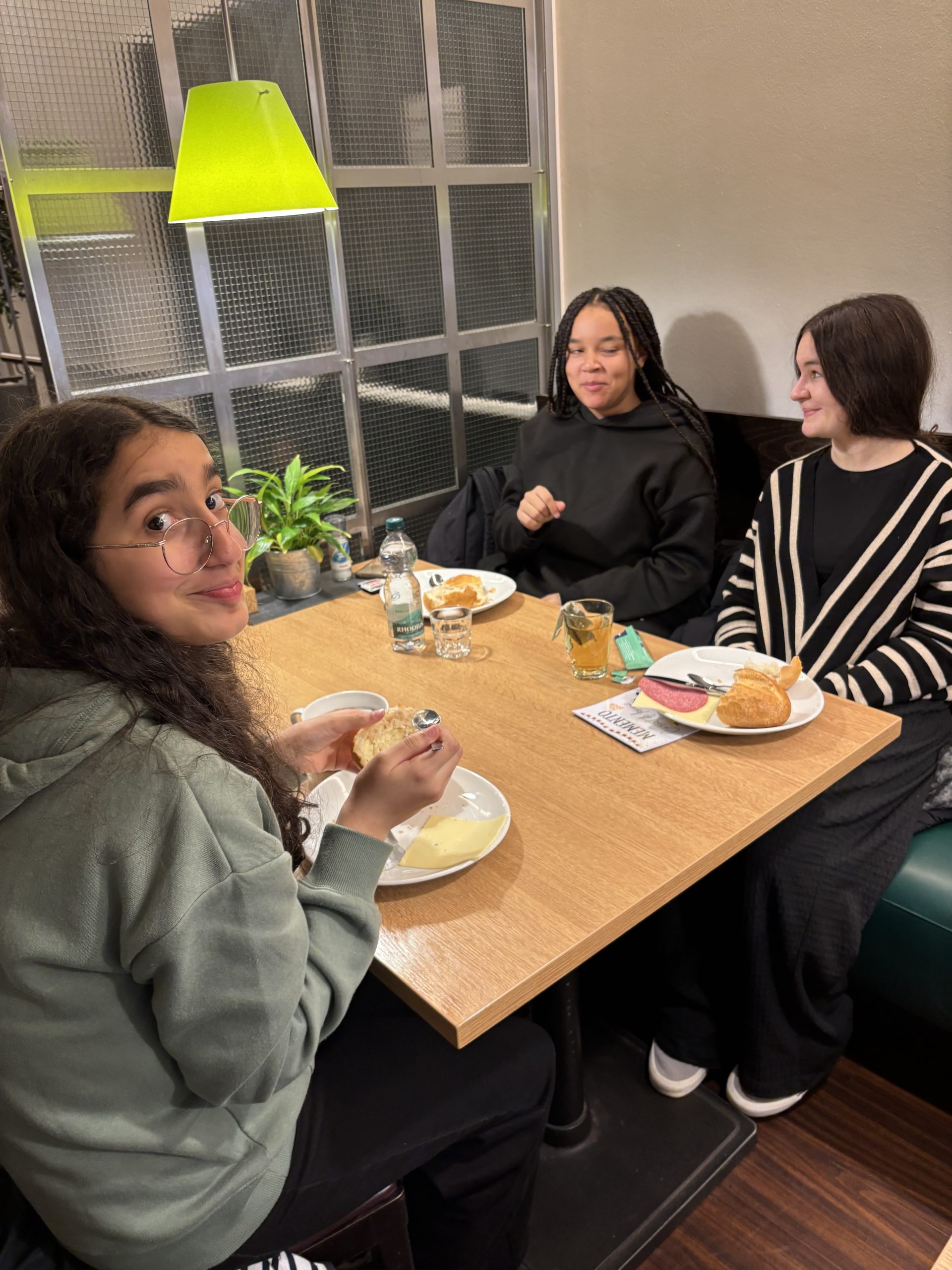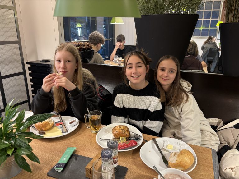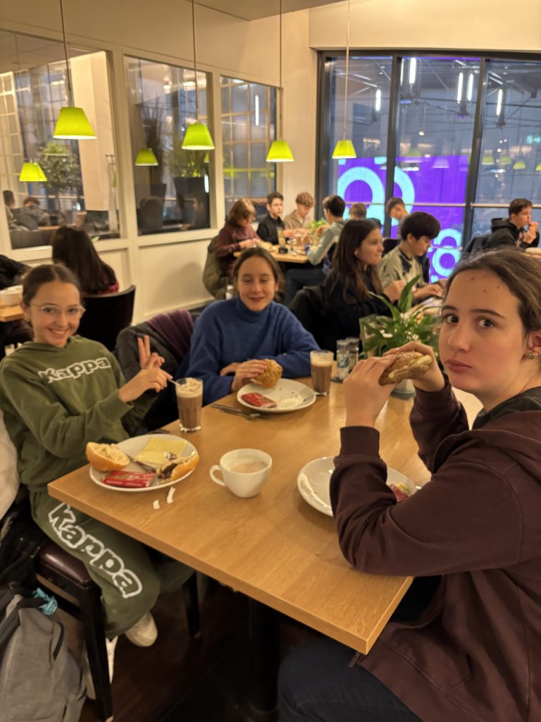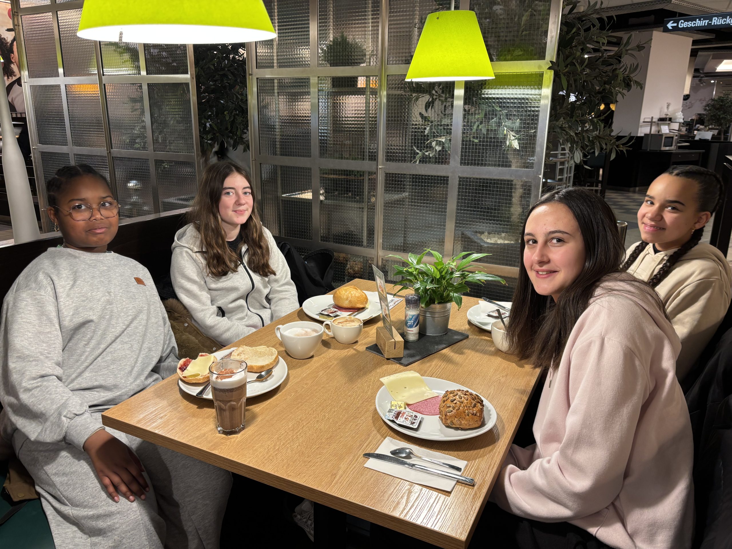 Après une nuit dans le bus, petit déjeuner typiquement allemand, avec pains variés, fromage, charcuterie, confiture, Nutella, beurre et boissons au choix.
