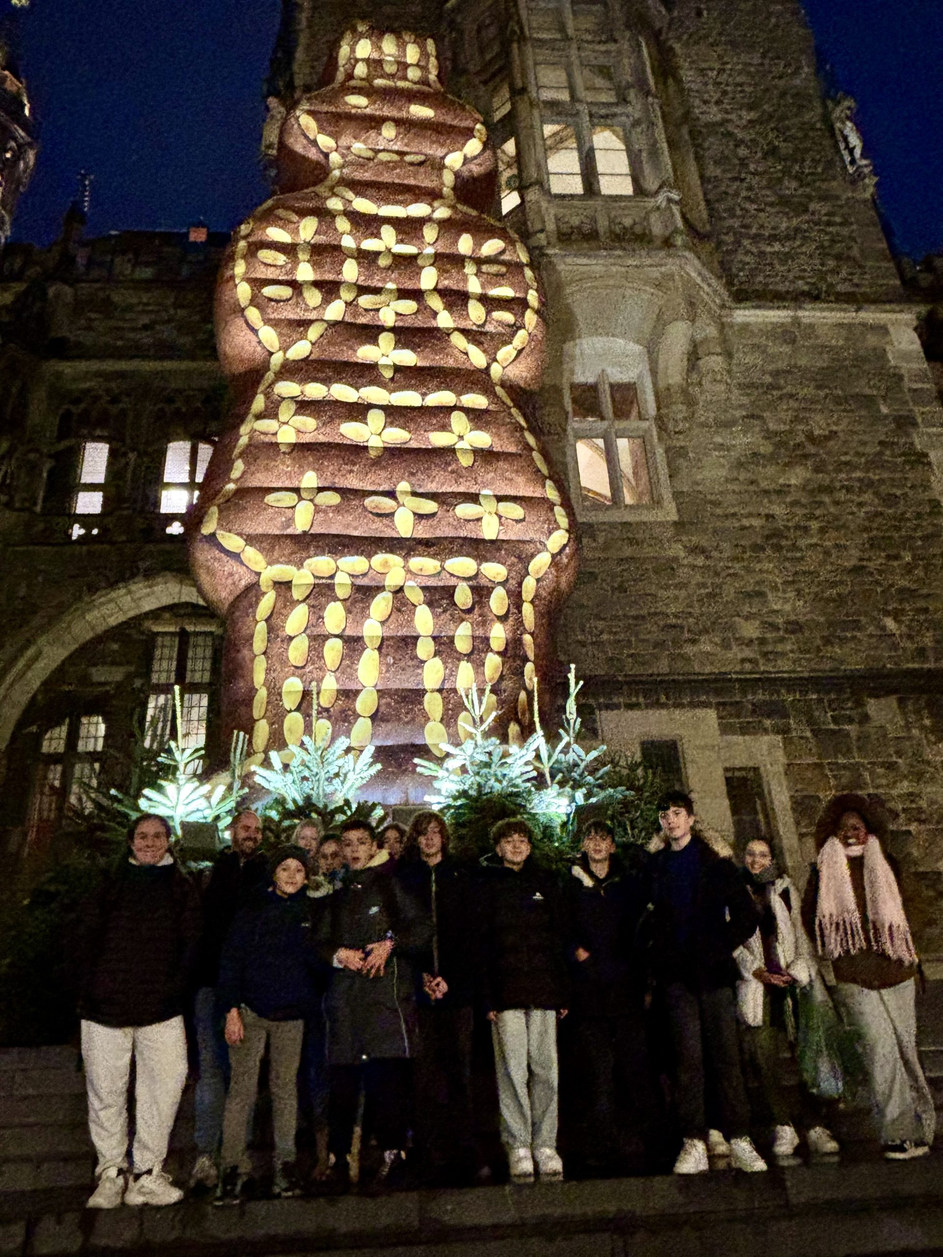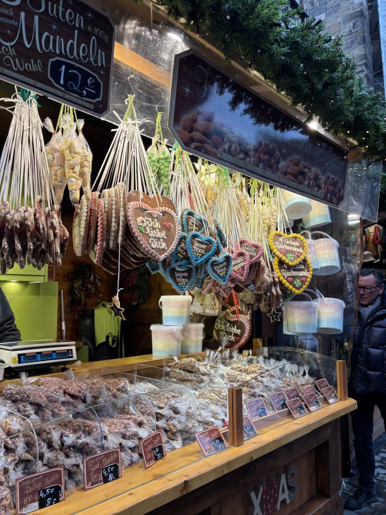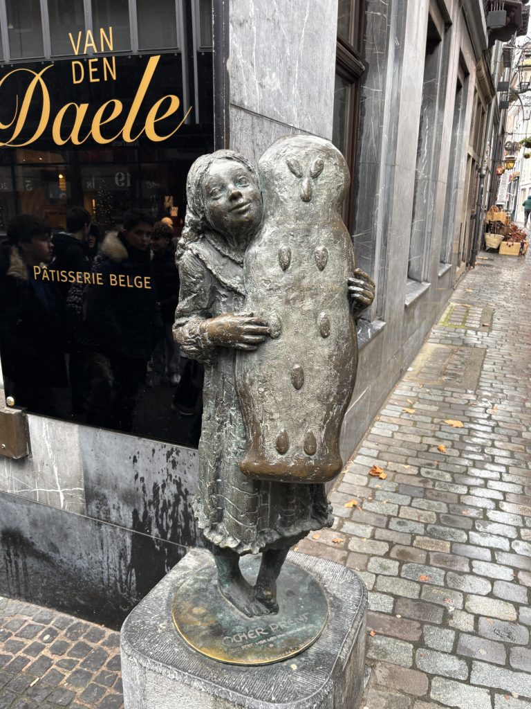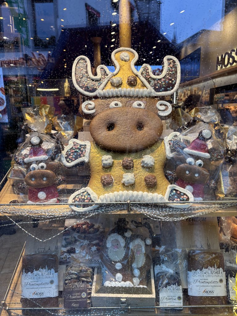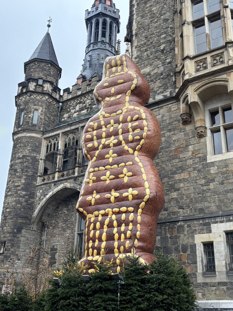 La jeune fille aux Printen (statue). Dégustation et achats de Printen- pains d’épices , grande spécialité d’Aix la Chapelle.