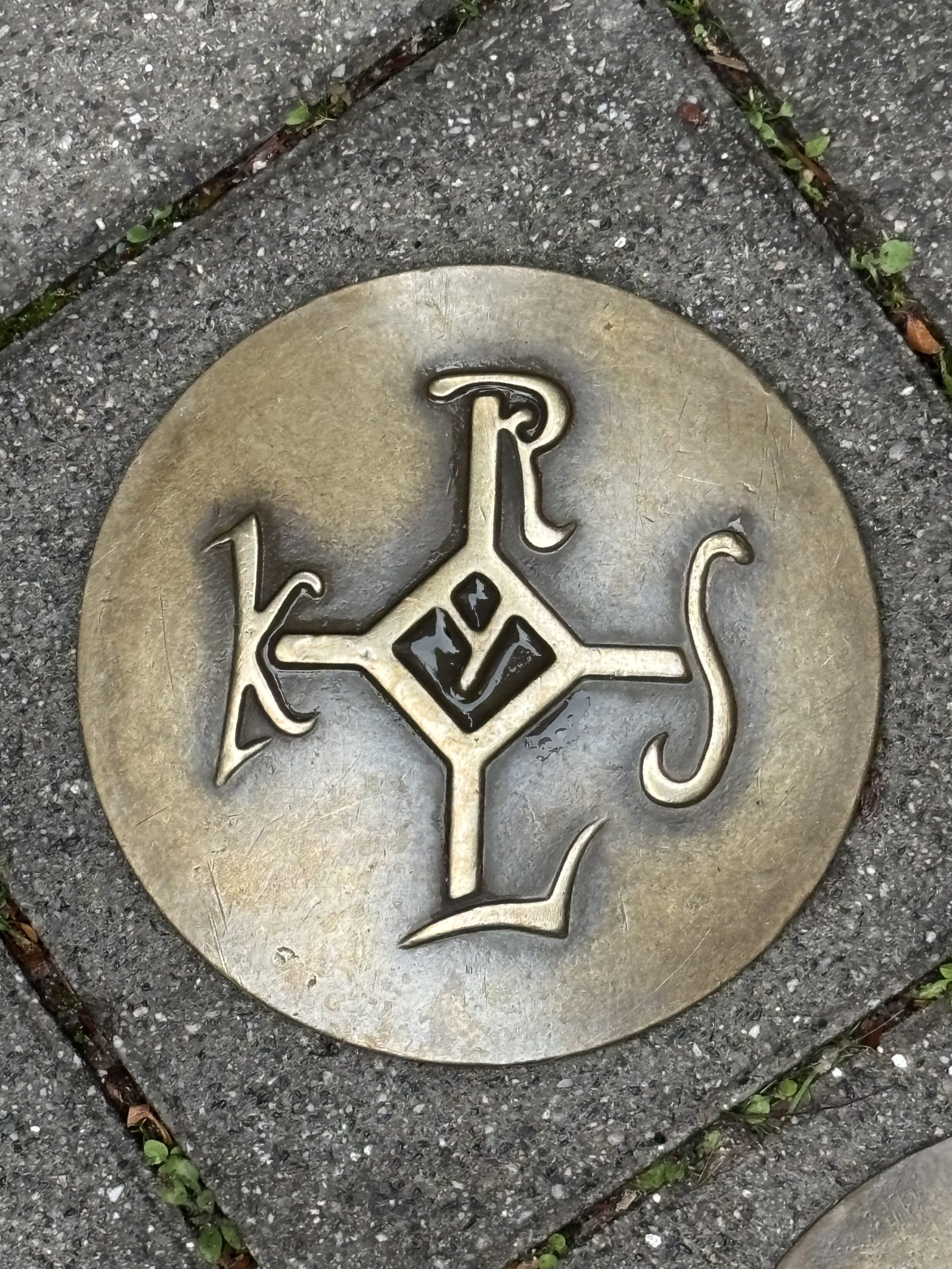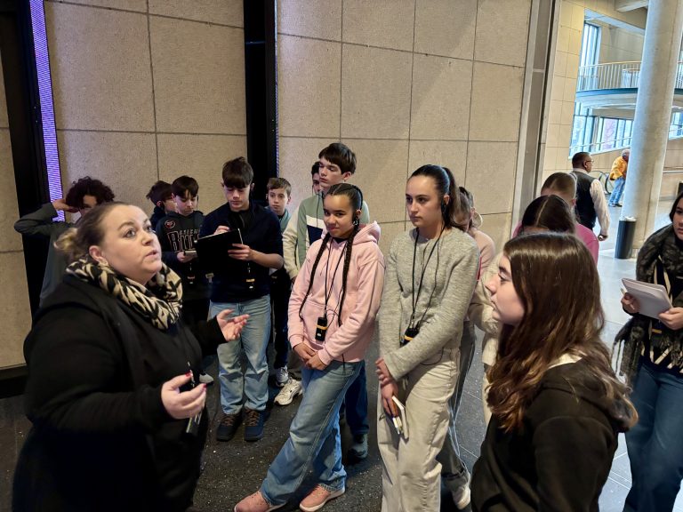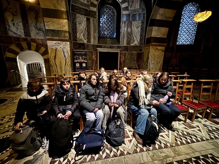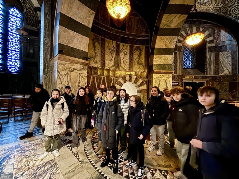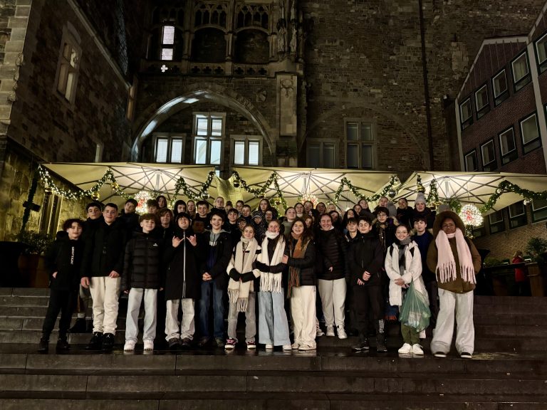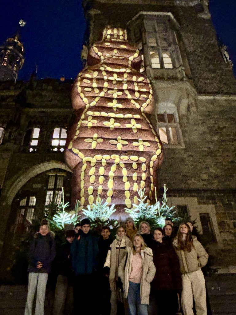 Dans les rues d’Aix, en grand groupe, à la découverte du monogramme de Charlemagne.